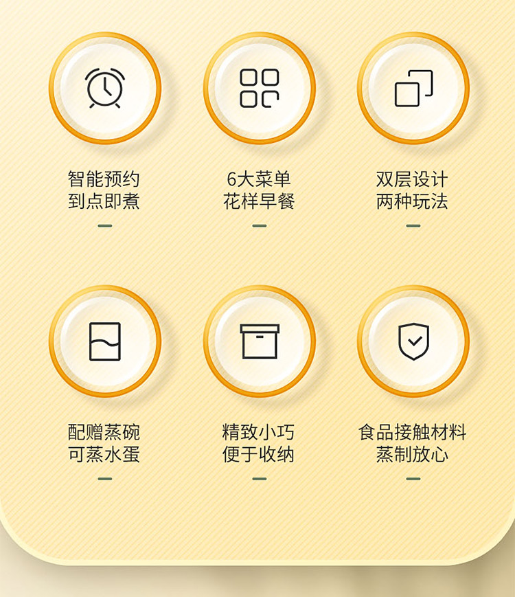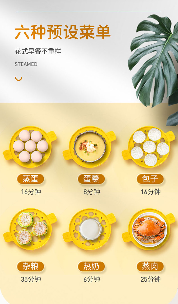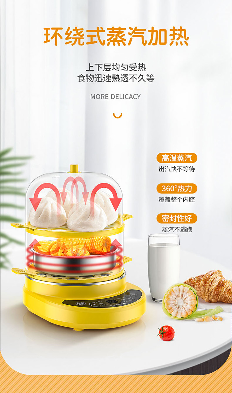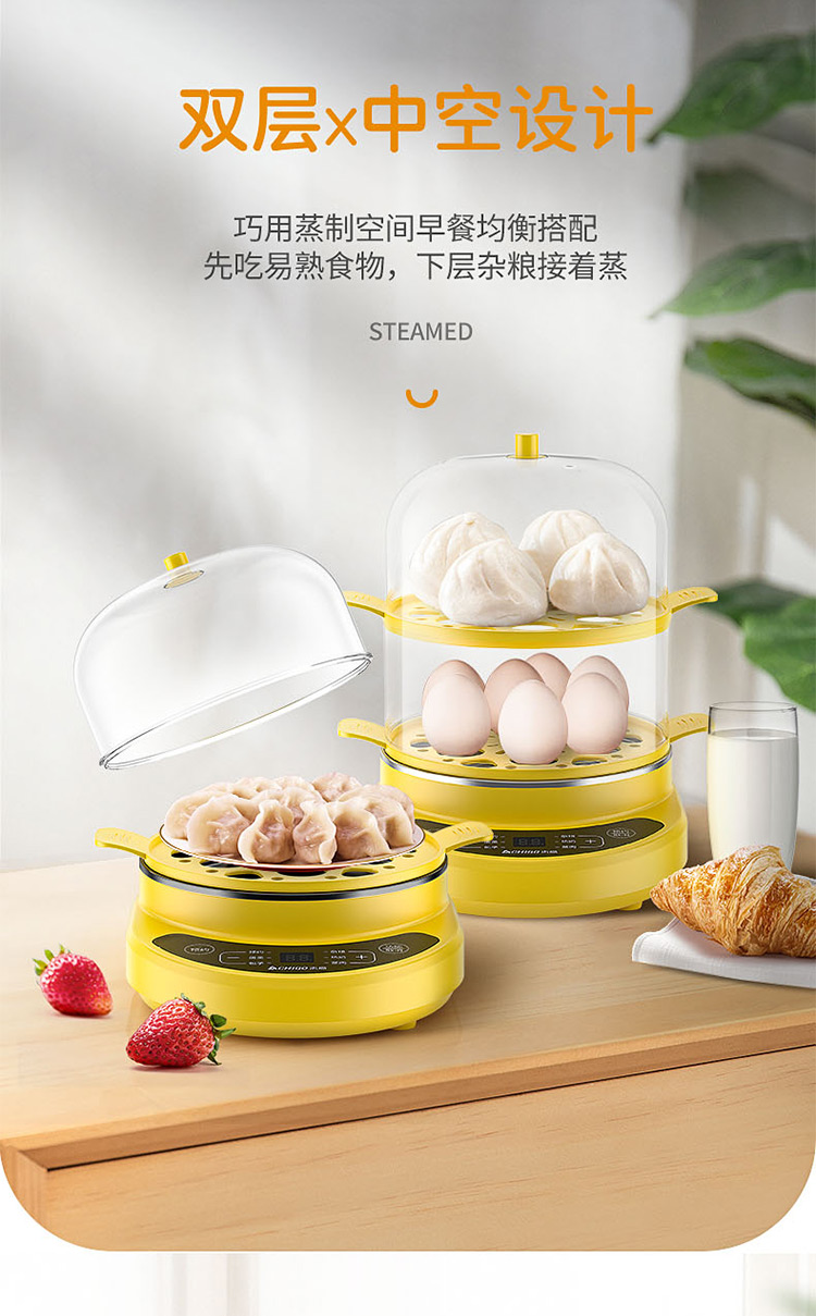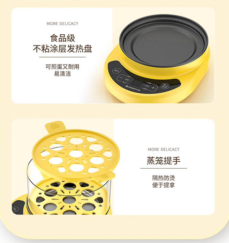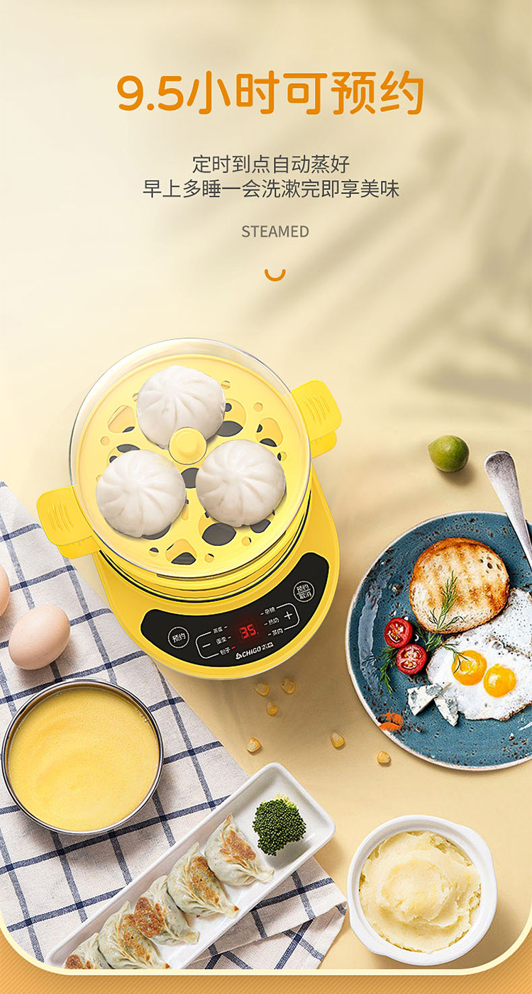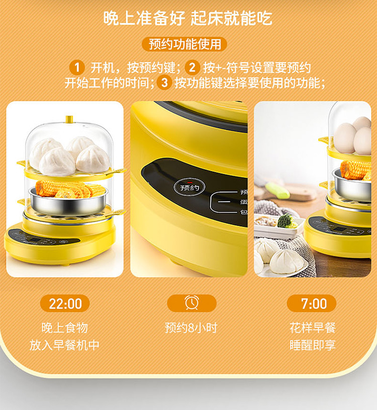 智能自动断电/定时预约/六大预设菜单/双层中空设计/食品级不粘内胆可煎蛋/配304蒸碗