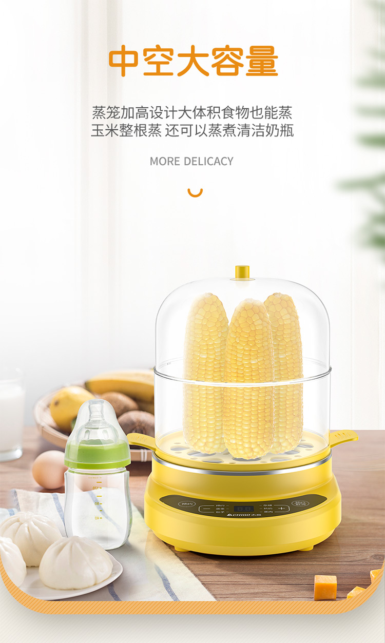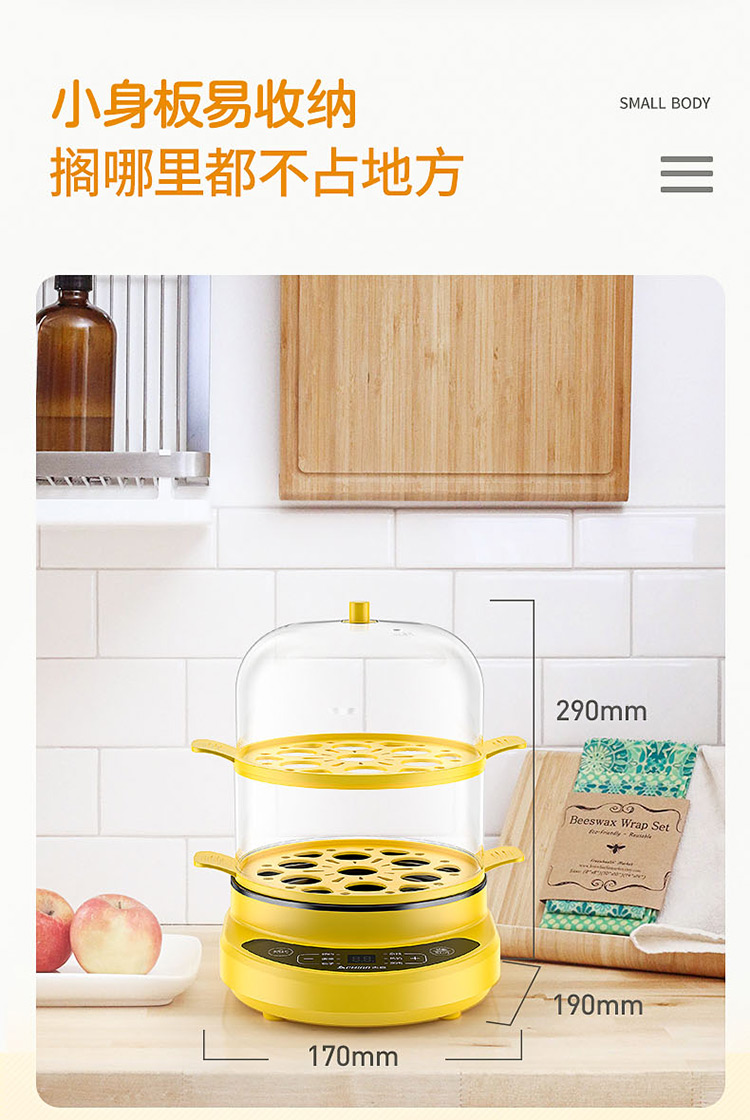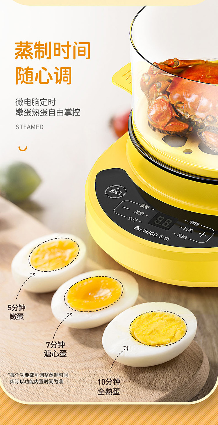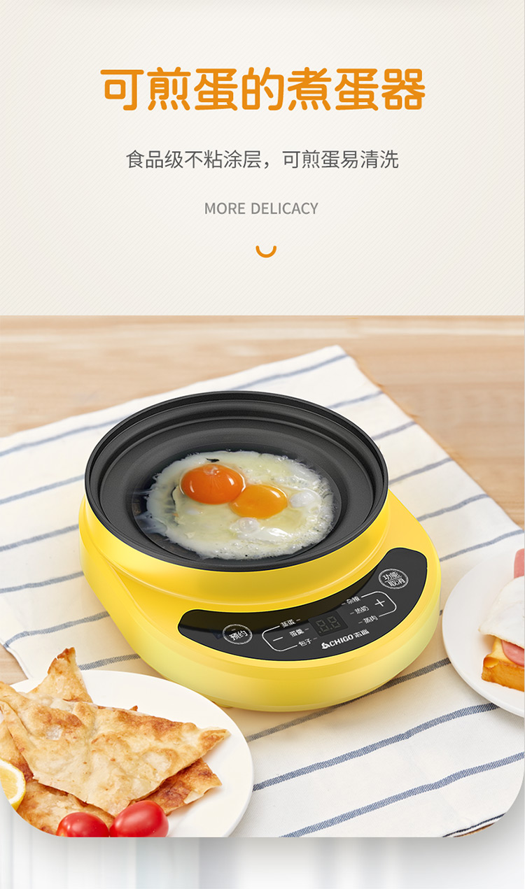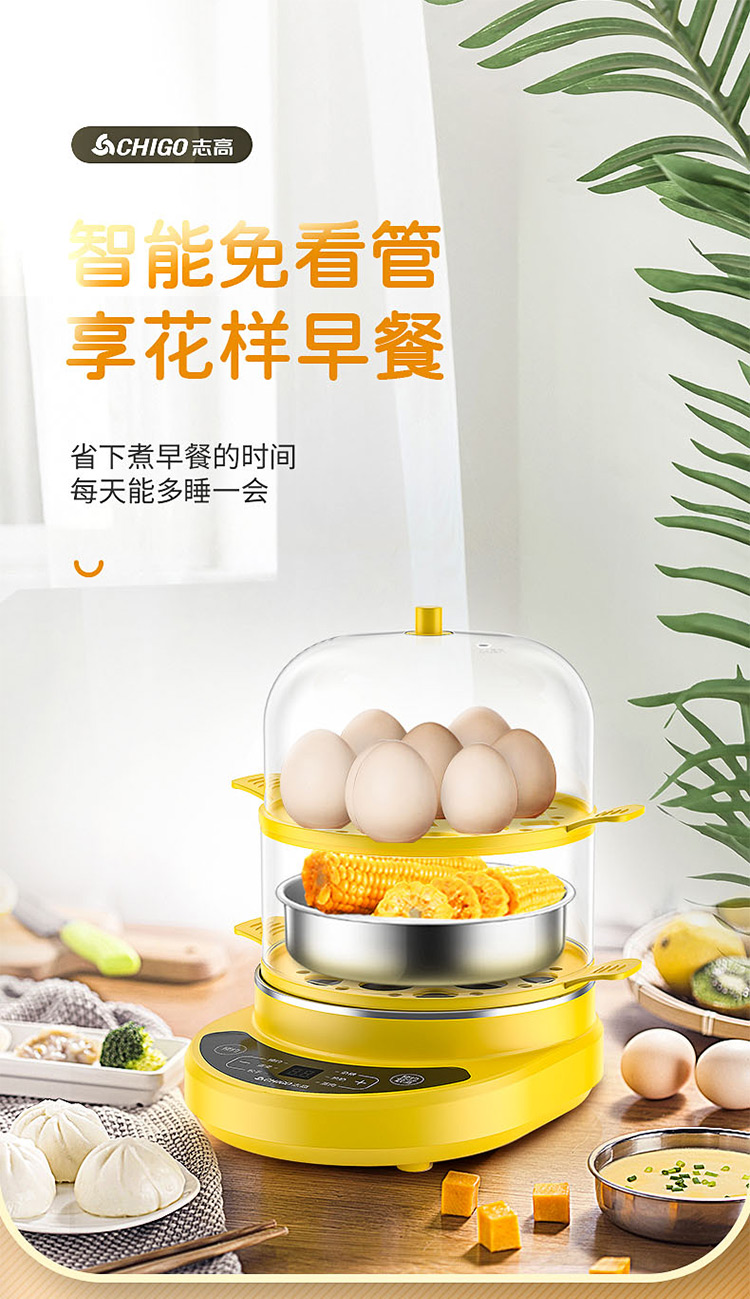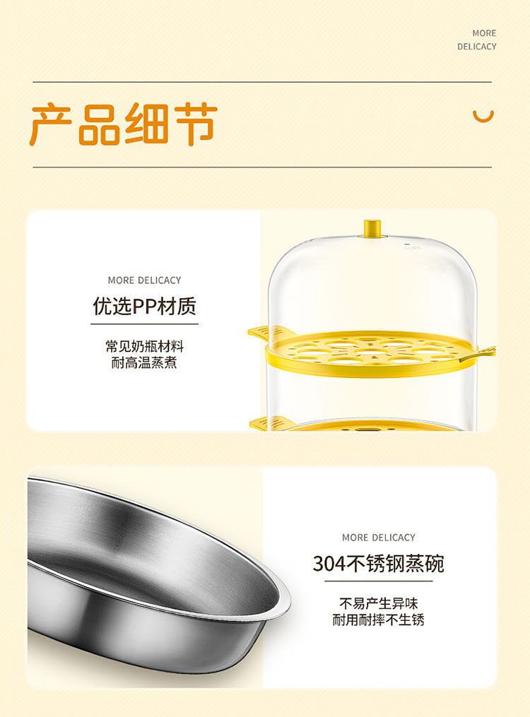 智能自动断电/定时预约/六大预设菜单/双层中空设计/食品级不粘内胆可煎蛋/配304蒸碗